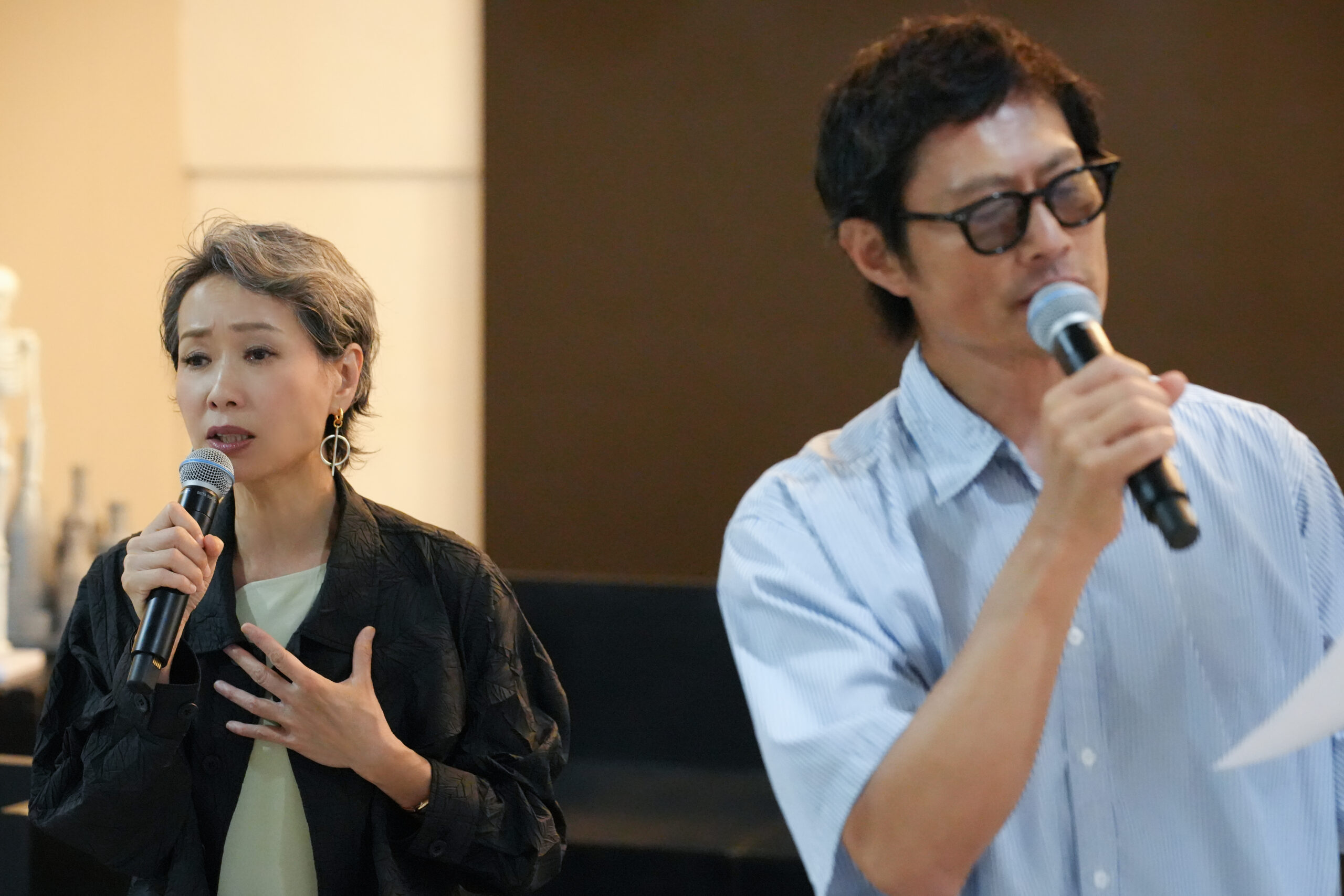 日前《唔講得》劇中五位演員包括葉童、黃德斌、楊永德、翁煒桐和李俊樂進行新一輪排練,德斌說:「呢個劇過咗咁耐再喺香港重演,對我嚟講係一個新鮮嘅體驗,因為今次有啲唔同,特別係音樂方面嘅處理方式,我會當佢係一個新嘅劇去做。」葉童:「我同德斌係上年合作呢個劇,之後我哋去咗幾個地方演出,9 月就會喺香港重演,大家都好開心。今次同德斌再合作有一種熟悉嘅距離感,唔知係咪一種感情嘅昇華,就好似要行番遠少少去觀望佢,去體會佢嘅感受嘅嗰種感覺,我唔知德斌佢點諗,但我覺得佢好似迴避緊我,佢開始對我有距離感!冇嘢嘅,我接受到嘅,有啲你唔想講嘅就唔好講,我明有啲嘢係唔講得嘅。」「今次重演我哋有個新嘗試,呢個新嘗試就係我同德斌喺個劇度本來係鬧交,鬧鬧吓就不如『唱』佢好似好啲。」德斌:「我哋會係現場互『唱』 ,將𥚃面一啲心底話『唱』出嚟。」葉童續說:「我唔單止會獨唱樂壇大姐大嘅歌,我仲會同德斌合唱一首天王天后級嘅歌,去『唱』出我哋係劇入面嘅心情。我哋一直以嚟都係用對白呈現感覺同故事,今次就將我哋嘅心情用歌曲呈現,我有一種『唱』德斌唱得好澎湃嘅感覺,我會周圍去『唱』佢。」