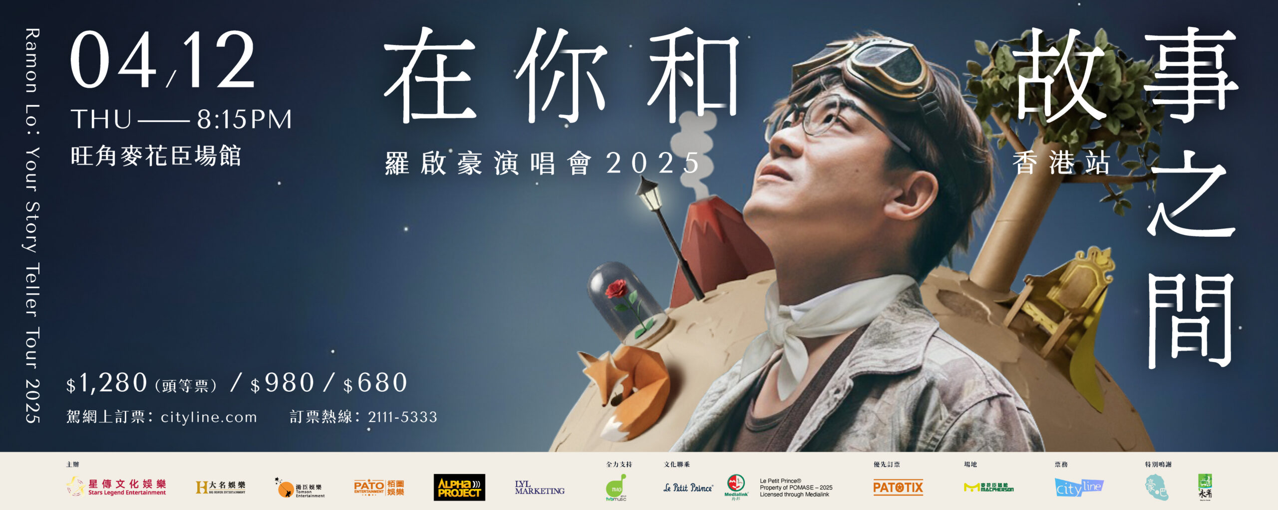 「羅啟豪《在你和故事之間》演唱會2025」更會融入法國經典童話小說《小王子》的故事元素,Ramon表示:「很高興今次演唱會可以和《小王子》文化聯乘,我將會以音樂重新詮釋愛與信念這個主題,讓這個經典故事能在舞台上綻放全新光芒,展現跨世代共鳴。由我設計的演唱會海報也是以此為概念,我以《小王子》中的飛機師造型,結合小說出現過的火山、玫瑰花和燈柱等不同像徵性事物,透過AI 科技延伸創意,打造出全新視覺世界,充滿幻想和趣味性。」