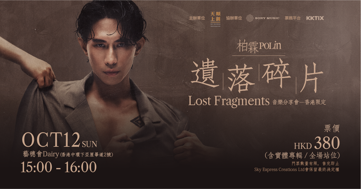 華語男歌手柏霖PoLin憑藉全新創作專輯《允許萬物破碎》入圍「第36屆金曲獎最佳華語男歌手」,他將於今個星期日(12日)在中環藝穗會Dairy舉行《遺落碎片Lost Fragments音樂分享會 – 香港限定》,趁著首次來港順道到香港電台、商業電台和新城電台接受訪問介紹《破繭》這首單曲,也在三個電台拍照留念。在訪問中,柏霖PoLin表示之前在台北舉行音樂活動時便有香港歌迷特意飛過去支持他,他們也有私訊問他什麼時候來香港和大家見面,所以他對今次音樂分享會感到非常興奮和充滿期待,屆時他將會在藝穗會的舞台上自彈自唱給大家欣賞。今次音樂分享會為全場站位,特別福利是分享會後柏霖POLIN親手送上簽名海報活動,票價一律為$380(含實體專輯),現尚餘少量門票於KKTIX公開發售。